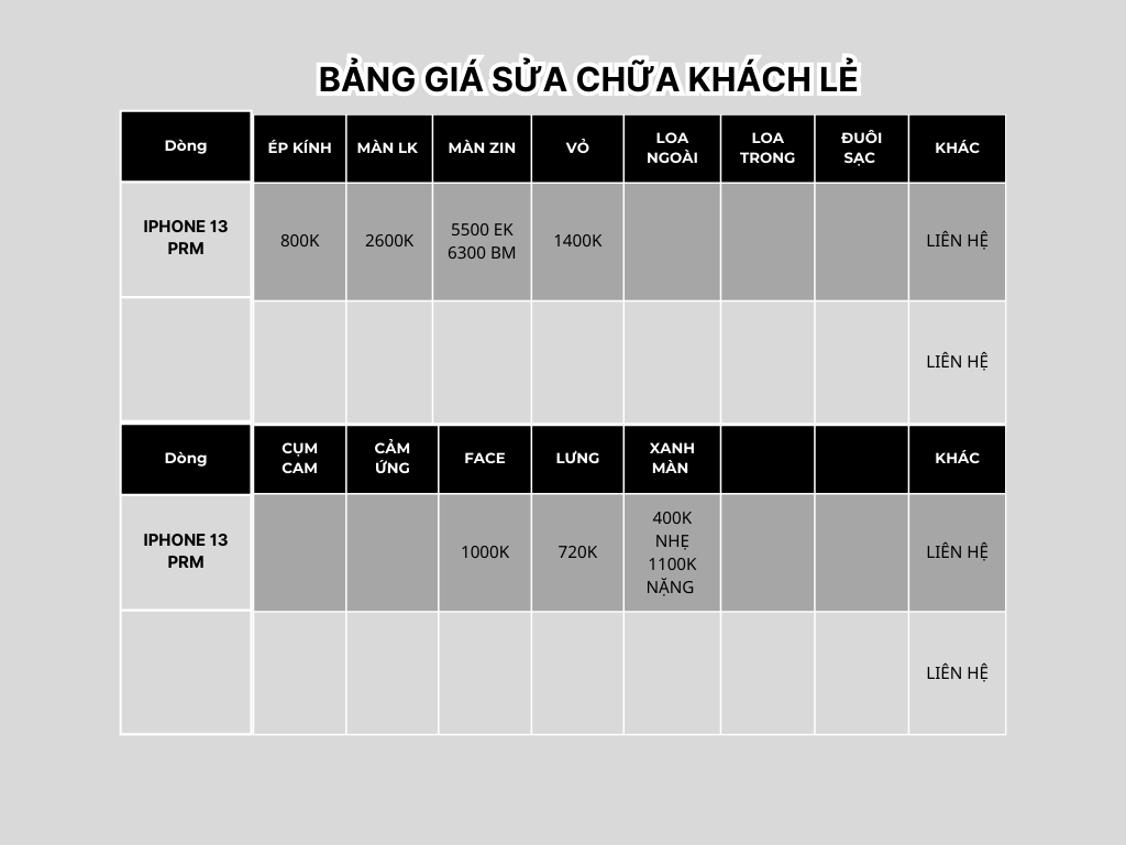 Bảng giá sửa chữa iPhone 13 Thường – 13 Pro – 13 Prm