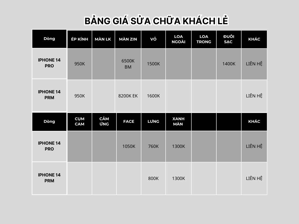 Bảng giá sửa chữa iPhone 14 Thường – 14 Plus – 14 Pro – 14 Prm