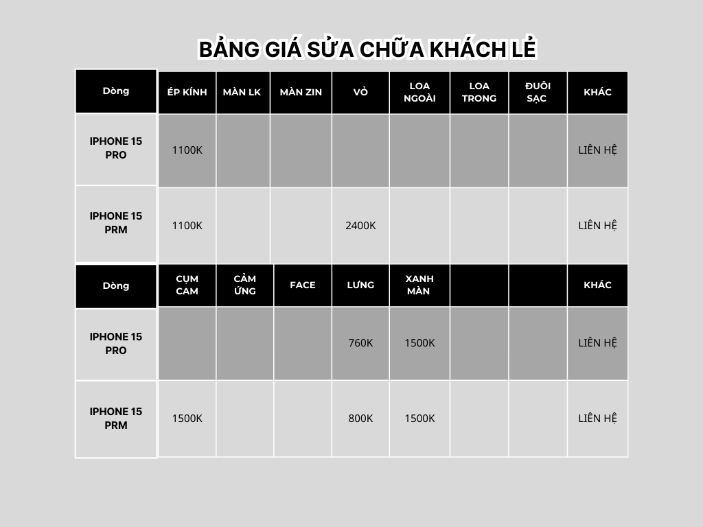 Bảng giá sửa chữa iPhone 15 Thường – 15 Plus – 15 Pro – 15 Prm